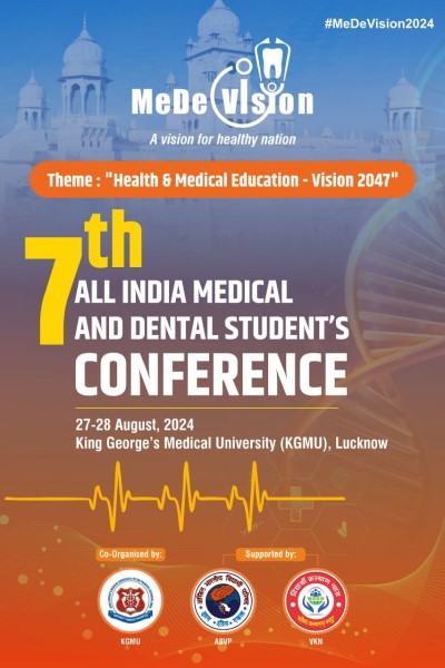 Start Date Tue, 08/27/2024 - 09:00 Wed, 08/28/2024 - 18:00 The 7th All India Medical and Dental Students Conference organised by MeDeVision is going to take place on 27-28th August 2024 at King George's Medical University (KGMU), Lucknow